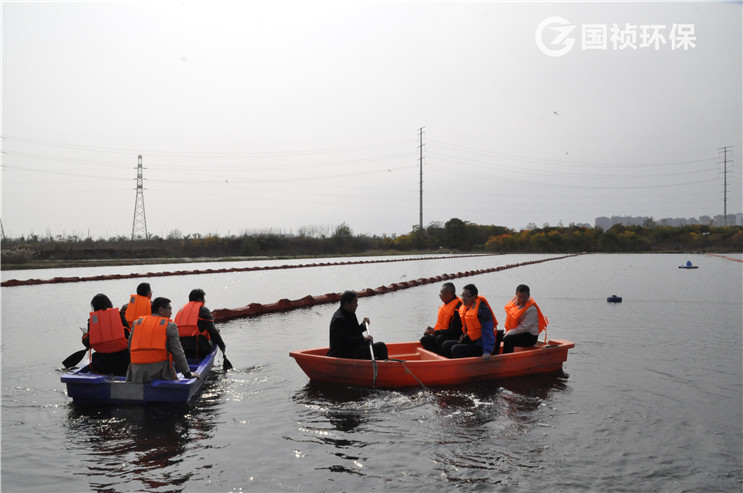 领导们乘船在许小河生态塘内查看水下森林及塘内水质
