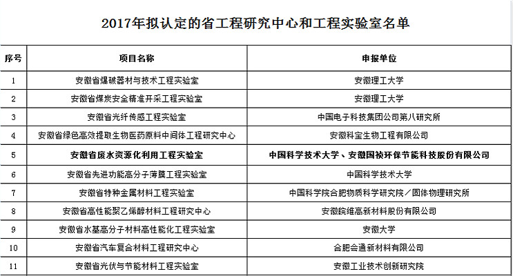 近日,安徽省发展与改革委员会发布了《2017年拟认定的省工程研究中心和工程实验室名单》,国祯环保与中国科学技术大学共建的“安徽省废水资源化利用工程实验室”成功获批。