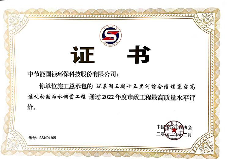 12月27日,“2022年市政工程建设产业博览会” 暨中国市政工程最高质量水平评价颁奖大会在长沙开幕。中节能国祯总承包的“京台高速处初期雨水调蓄项目”通过2022年度“市政工程最高质量水平评价”。同时,我公司作为建设单位的清溪净水厂PPP项目和胡大郢污水处理厂PPP项目也获此殊荣。