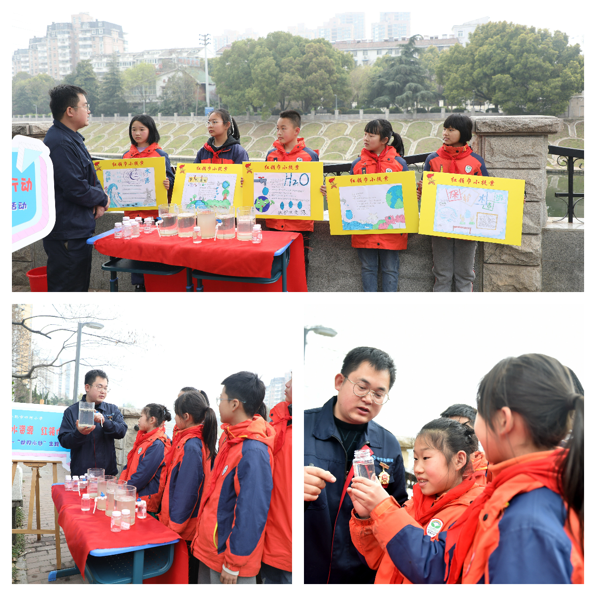 仪式结束后,全国技术能手、“安徽省五一劳动奖章”获得者、中节能国祯员工杨策,带领四河小学五(2)中队同学们来到南淝河边,开展了一场别具一格、内容精心设计,以“珍惜水环境 红领巾在行动”为主题的世界水日实践活动。活动中不仅有“世界水日”知识竞答比赛、“污水变清泉”动手实验,学生们还现场开动脑筋,拿出污水防治的“红领巾小提案”。珍惜水、节约水、保护水资源的环保理念逐渐深入孩子们的心中。